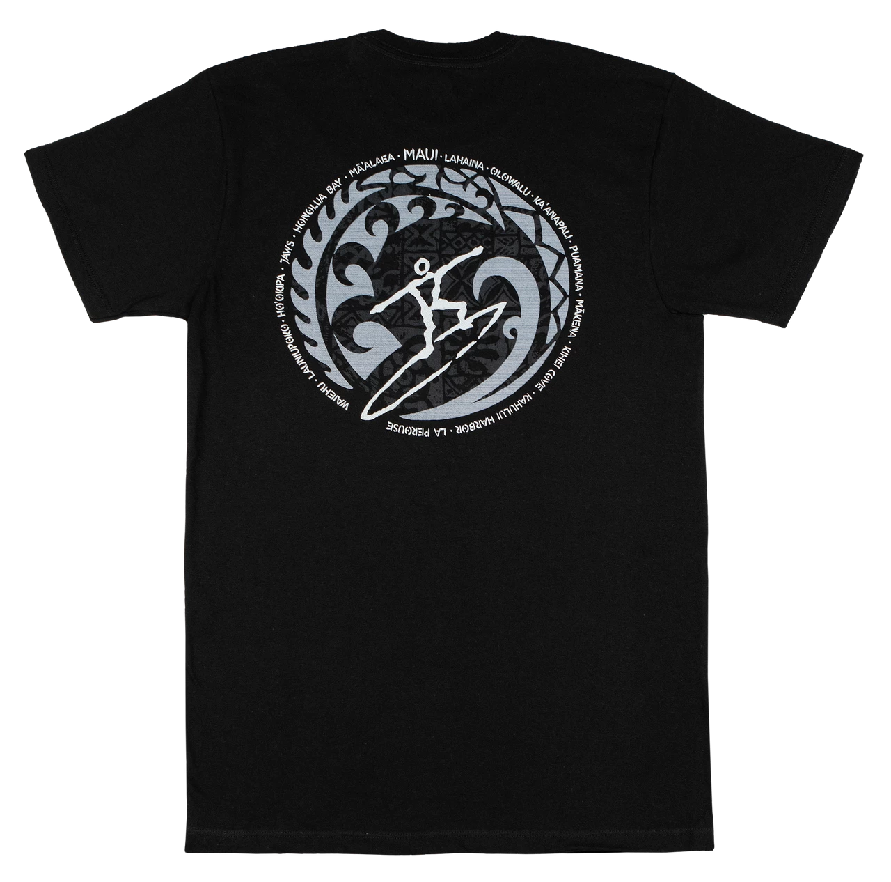 This design features a petroglyph inspired surfer while showcasing some of Maui’s most famous and wellknown wave riding beaches.