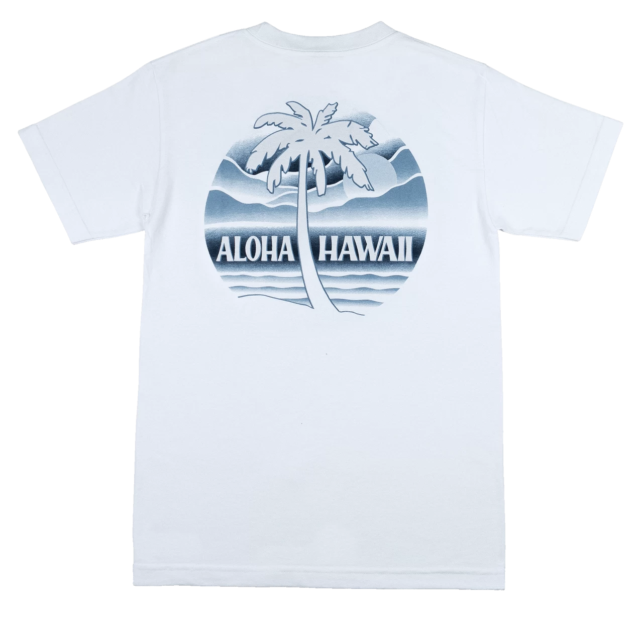 Single palm tree swaying in breeze on a moonlit night overlooking the ocean paradise in sleek silhouette.