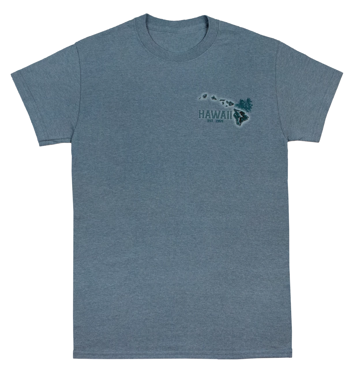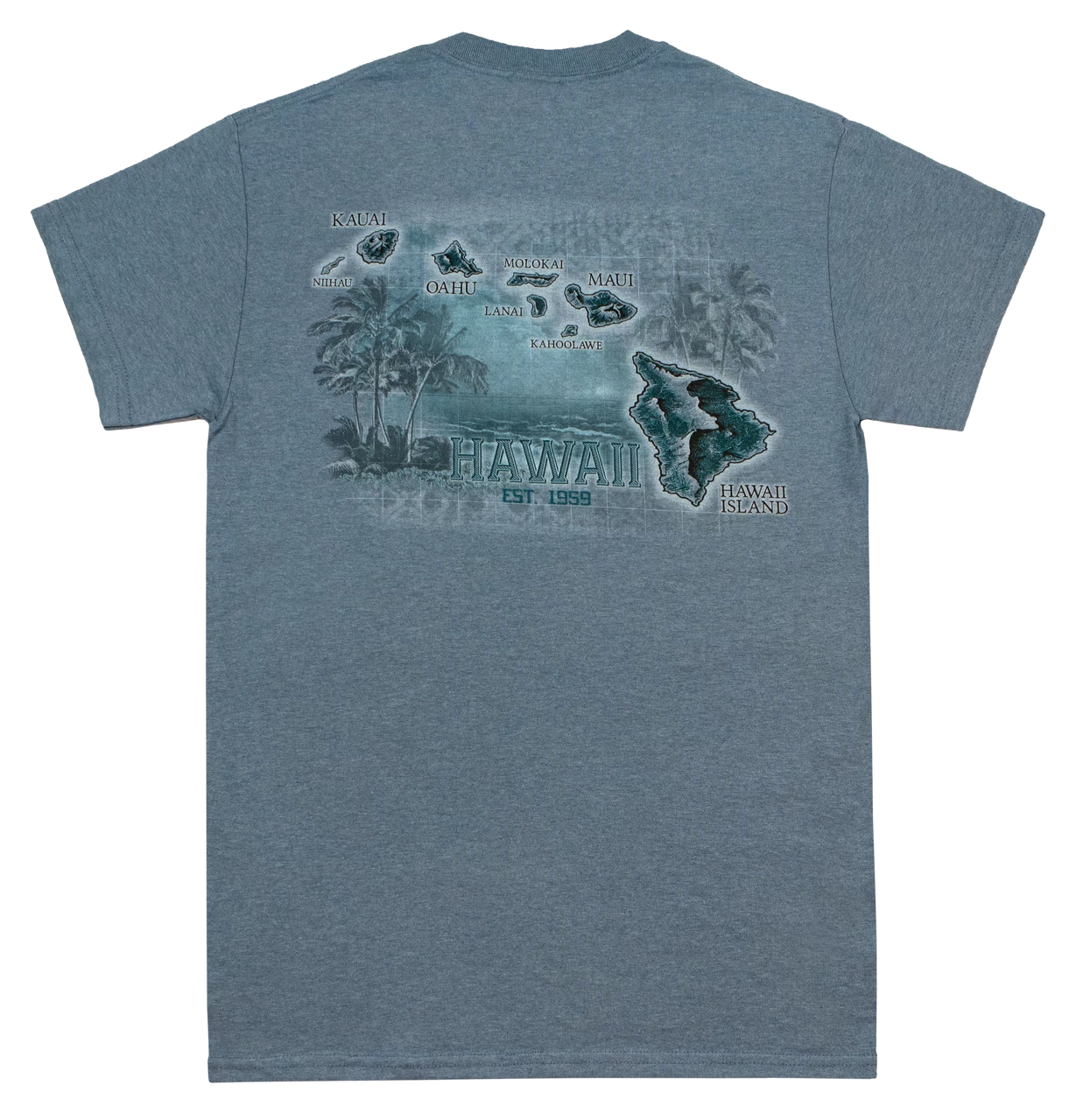 A topographical map of the Hawaiian islands over a beautiful shoreline backdrop.