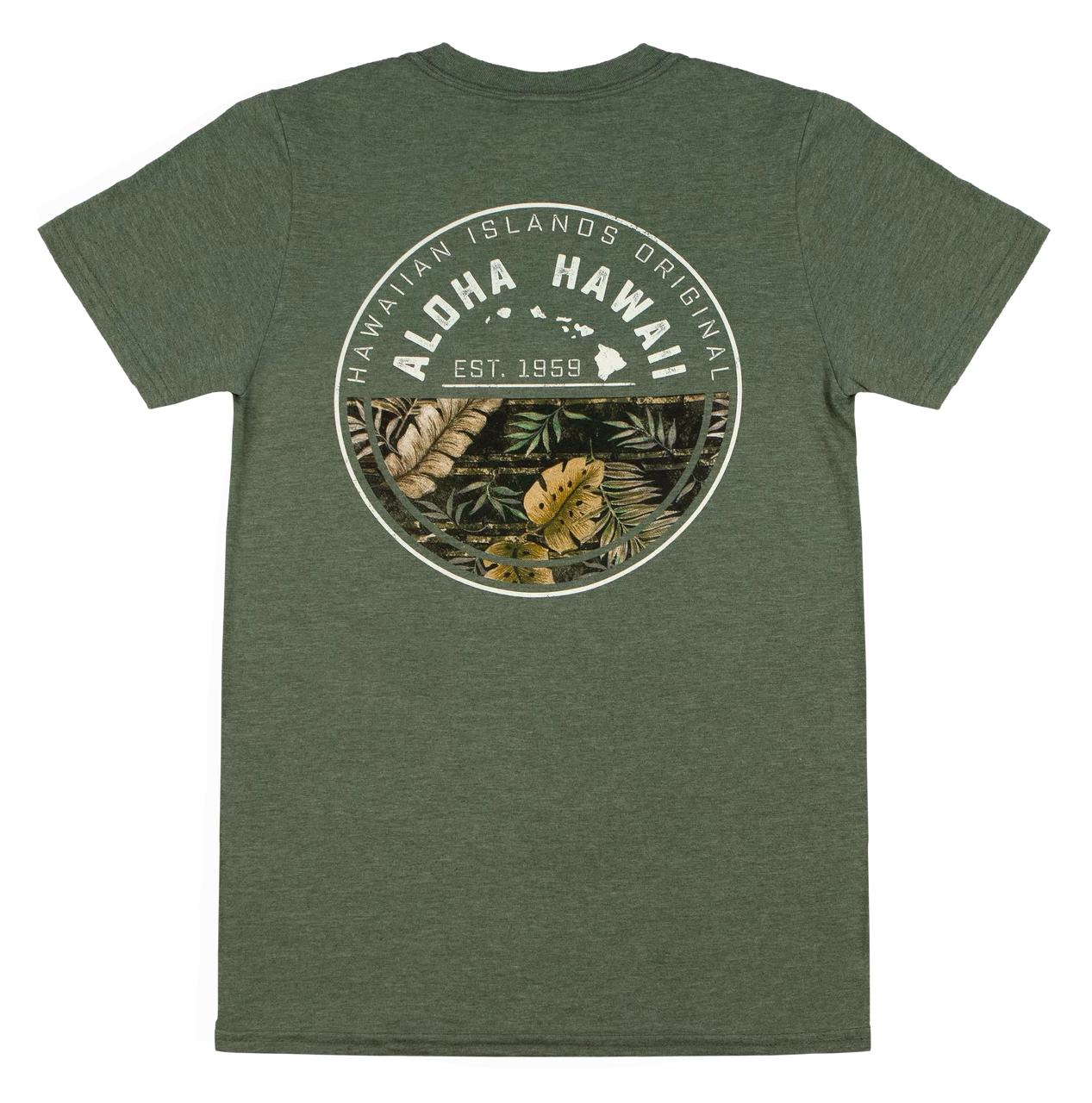 This iconic print features the Hawaiian Islands along with tropical rainforest imagery.