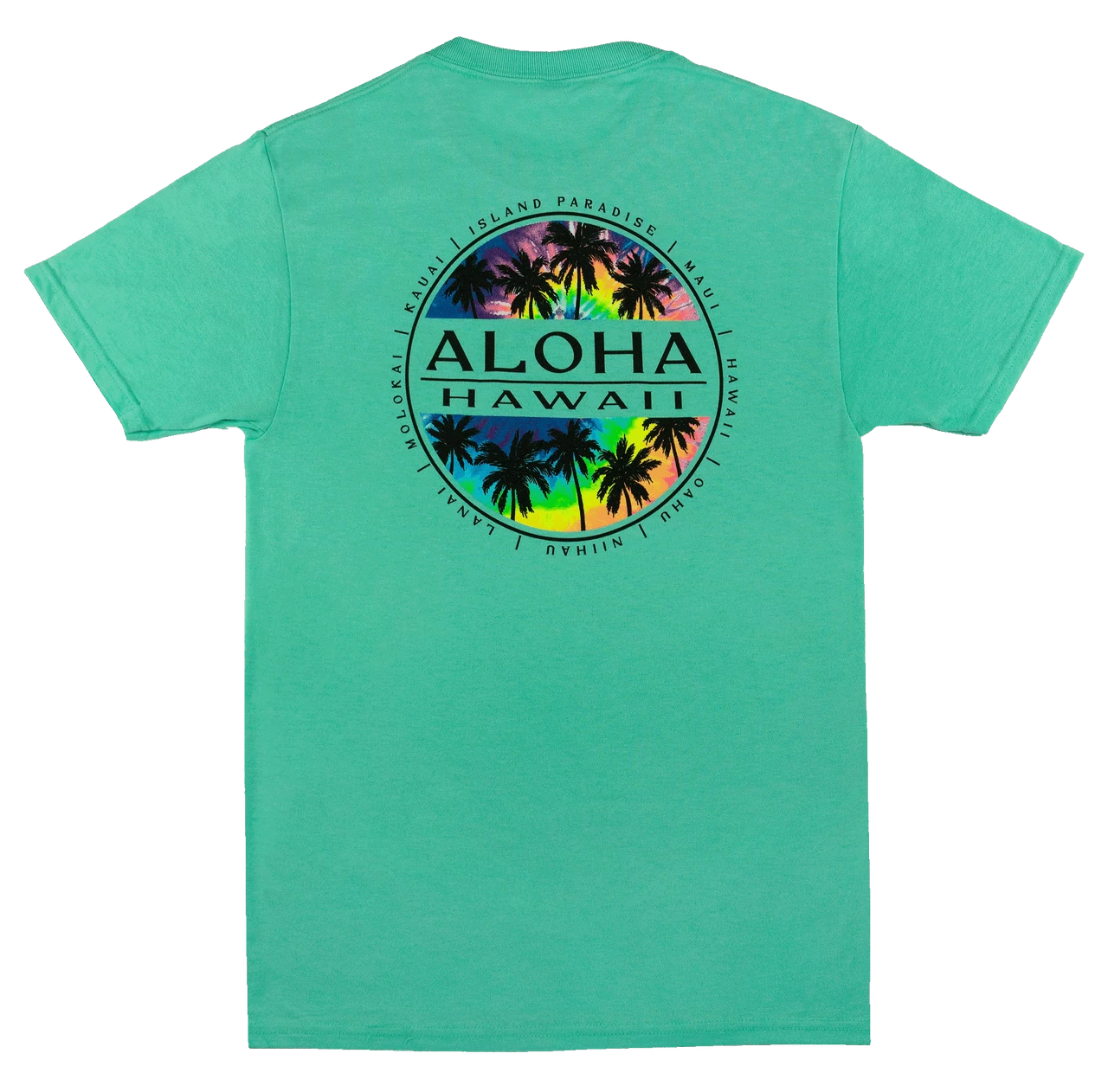 Bringing Tie Dye back! These “psychodelic” colors blend the old with the new in a colorful palm tree circular design