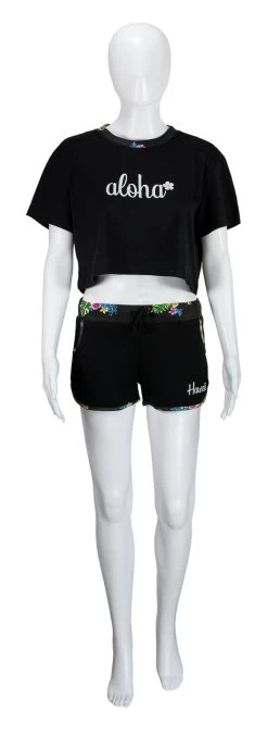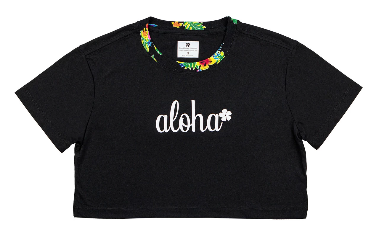 This tee has a relaxed fit that’s cropped above the navel with a Hawaiian printed neckline.