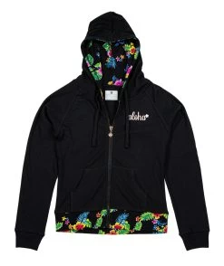 Zip up sweatshirt with drawstring hood which is lined in a Hawaiian print. This hoodie also has a front kangaroo pocket along with a printed band at the waist that is form fitting for flattery and contoured to accentuate!