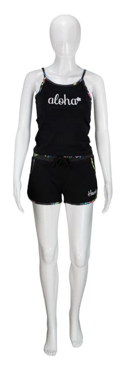 Strap tee with Hawaiian printed trim that is form fitting for flattery and contoured to accentuate!