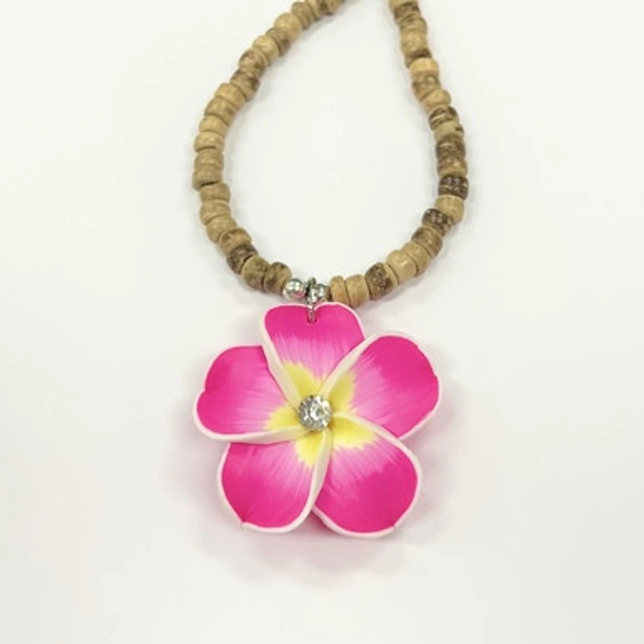Island-inspired beaded necklace with a Pink plumeria pendant. Great for natural styles.