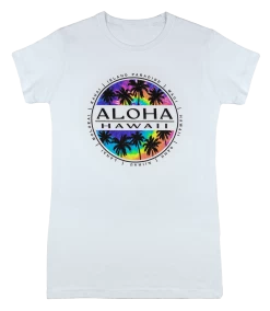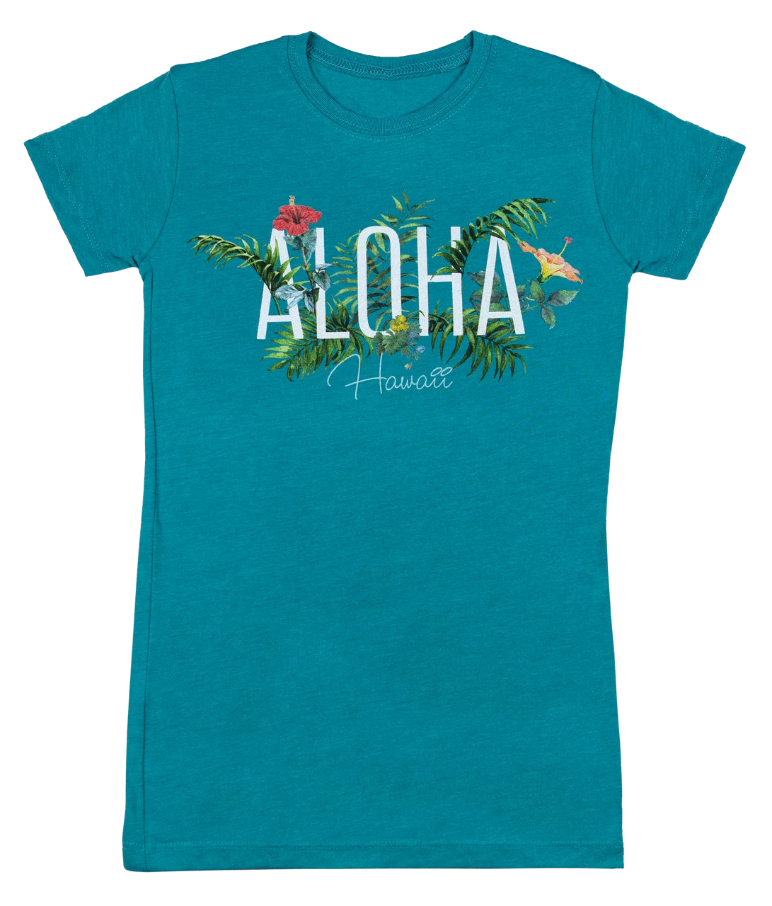 Garden Aloha Hawaii tee blooming with red and yellow hibiscus flowers and monstera fern leaves.