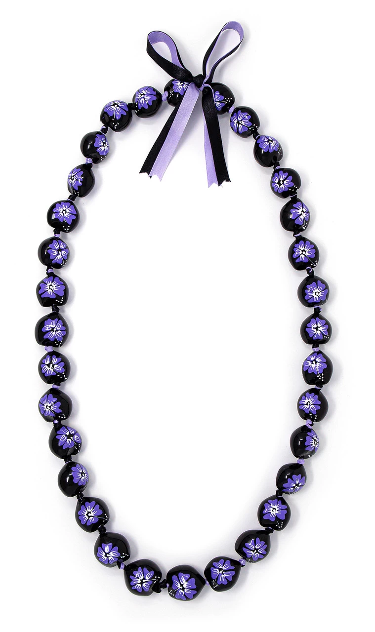 Made from 32 genuine Kukui Nuts, each lei measures approximately 38 inches in length with a colorful and adjustable ribbon tie. Each kukui nut is smoothed and polished to perfection before having a hand-painted hibiscus flower added on two sides of each kukui. These colorful additions add a touch of flair and are great for more casual events. They may also be given as congratulatory gifts, or even used as accents to add some tropical fun to the home or office.