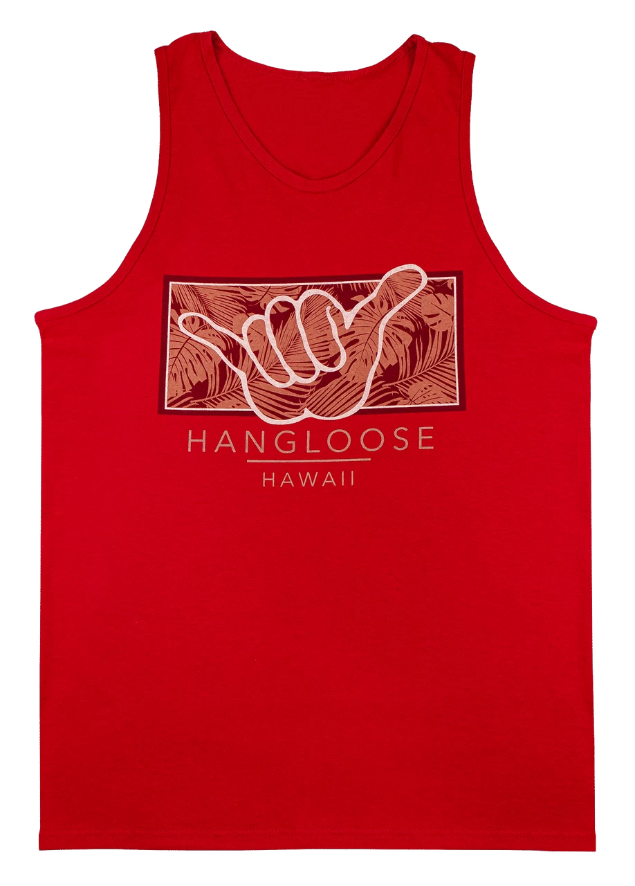 The iconic “Shaka,” known throughout the Hawaiian islands as a casual and friendly greeting, laid over a monstera and fern leaf background.