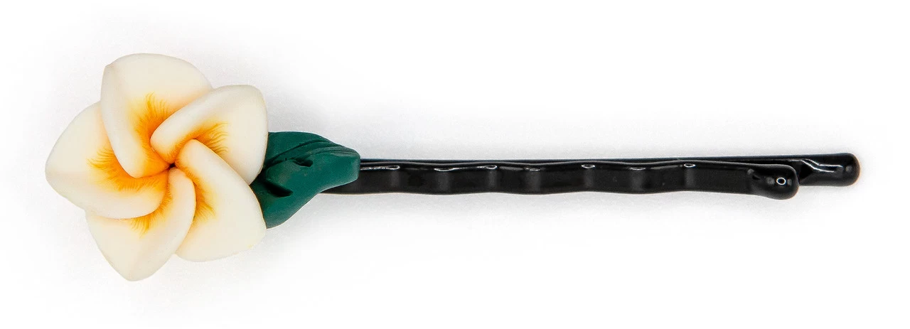 Pretty plumeria blossoms measure approximately 0.625″ in diameter – on a durable black bobby pin. Set of Two.