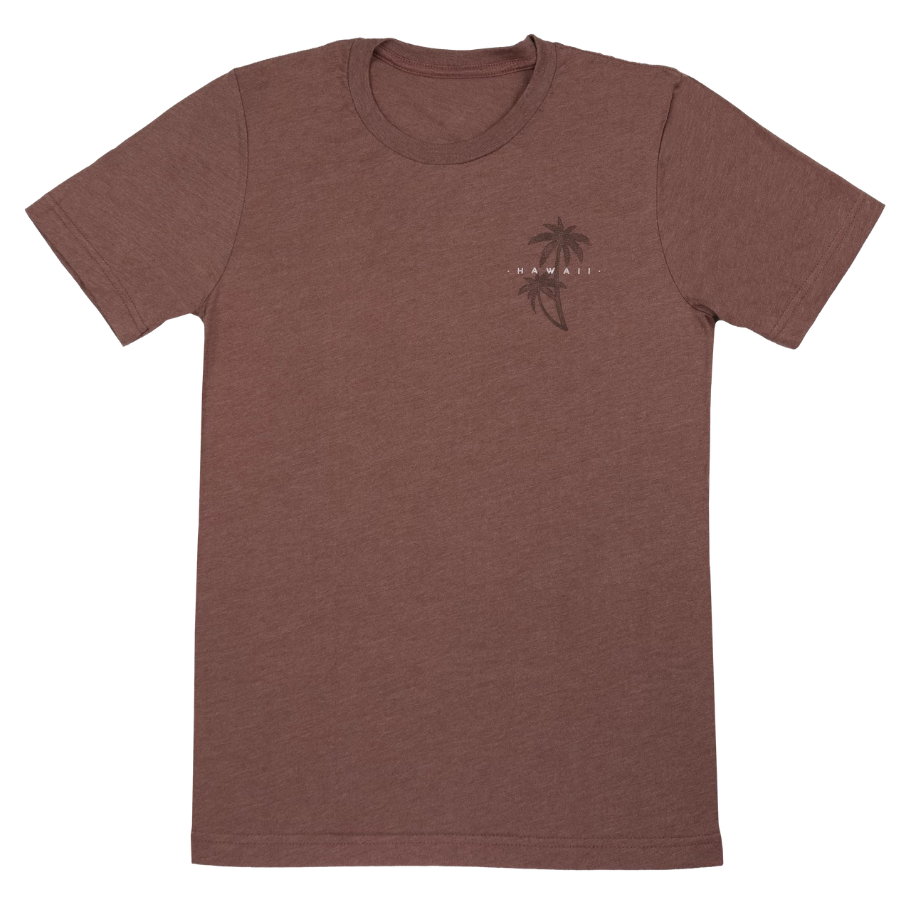Stylized shorebreak background with idyllic palm tree silhouettes.
